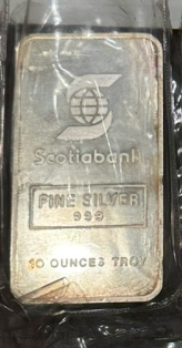 | Notes | Scotiabank-branded Engelhard Canada silver bar, serial number 001556. Highly trusted bullion with strong resale demand. | ||